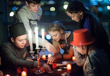 Ведущий создает атмосферу Викторианской Англии с помощью реквизита и музыки. Затем распределяет роли и объясняет правила игры. Вы с друзьями располагаетесь за столом, свет гаснет, загораются свечи. Медиум входит в транс. «Спиритический сеанс» начинается.